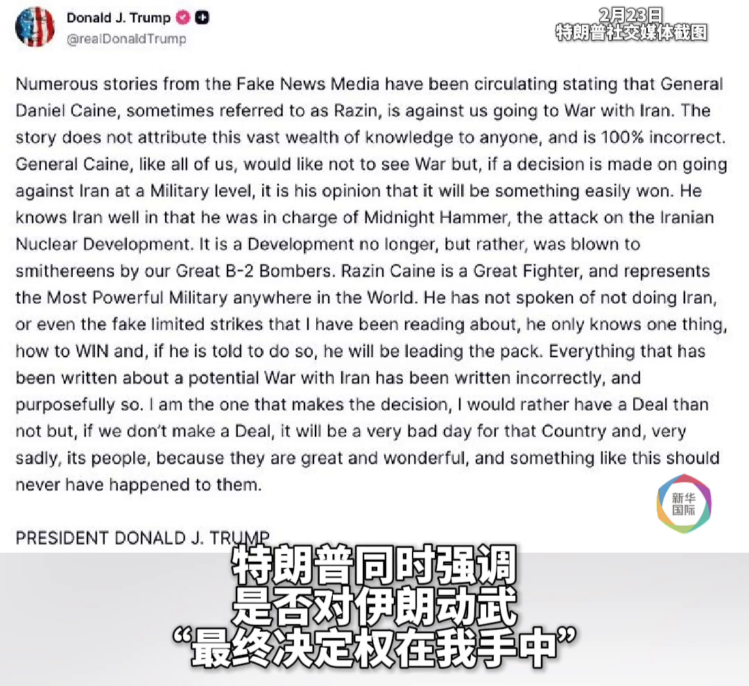 23日,美国总统特朗普在社交媒体称,自己“更希望(与伊朗)达成协议”,以避免美国发动军事打击,但德黑兰至今仍不愿明确表态不会发展核武器。如果不能达成协议,对伊朗来说将是“非常糟糕的一天”。特朗普同时强调,是否对伊朗动武,“最终决定权在我手中”。