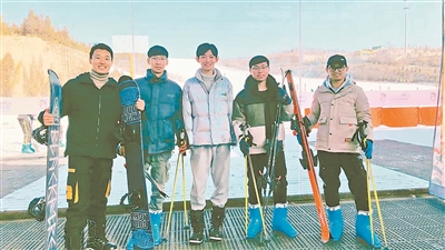 图为王海港(左三)和同学一起滑雪。 受访者供图